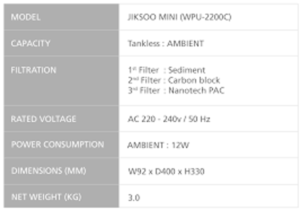 JIK.SOO Mini adalah yang paling tipis dari semua model JIK.SOO. Pilihan yang bagus untuk mereka yang mencari penulen air "tanpa tambahan" bajet. Hebat untuk meja kecil atau countertop.