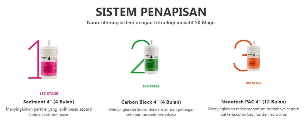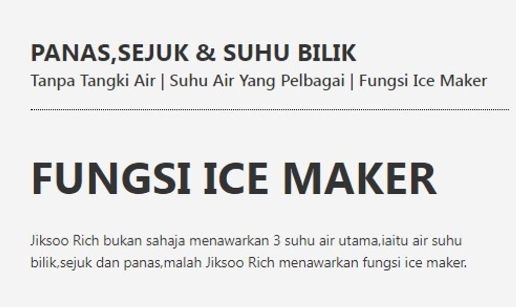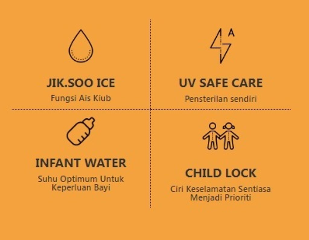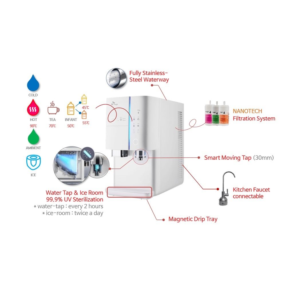 Penapis air mempunyai 5 suhu untuk dipilih dengan rekabentuk table top tanpa tangki (JIK.SOO) yang jimat ruang tanpa memerlukan ruang tangki air yang besar.