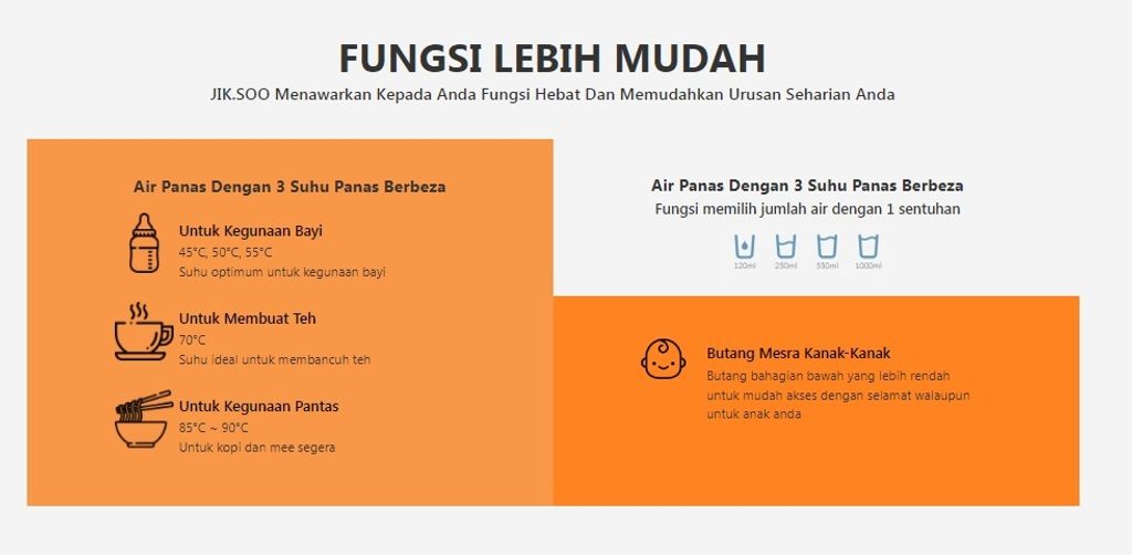 Anda boleh memilih sukatan air 120ml, 250ml, 550ml dan 1 liter. Sama ada cawan atau botol, JIKSOO Rich boleh menampungnya.
