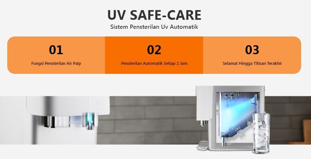 Gelombang UV yang tidak merbahayakan manusia pada tab air BERKESAN menghilangkan 99% mikrob untuk air mineral bebas lenderan, kulat, alga, kuman dan bakteria dalam air.