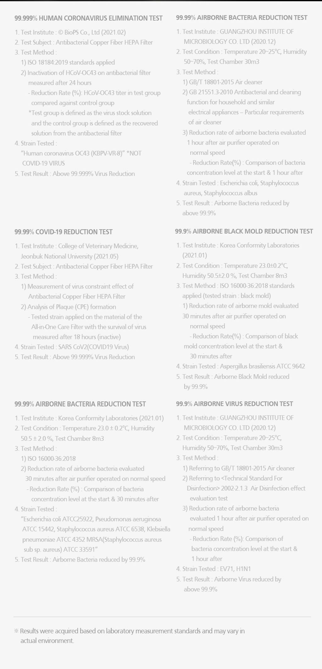 Apa yang menjadikan pembersih udara berfungsi dengan baik terhadap virus seperti novel coronavirus ialah gabungan UV Photocatalyst dan Copper Fiber. Ujian makmal terkawal di Korea telah menunjukkan pengurangan virus sehingga 99.99%.