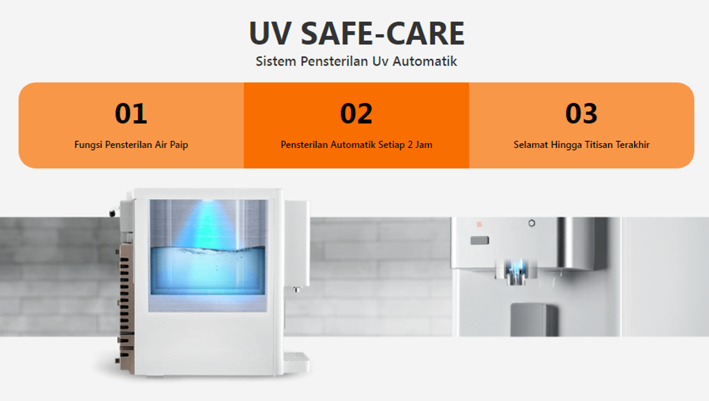 - Penjagaan Selamat UV - Pensterilan sendiri. Sentiasa simpan paip dan muncung untuk menghapuskan bakteria.
