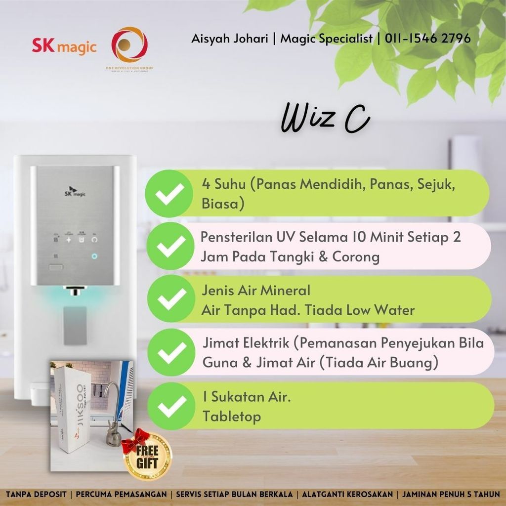 WIZ C ialah penapis air panas dan sejuk dengan volum tinggi. Ia boleh memuatkan sehingga 1.65 liter hingga 3.5 liter air panas. Lebih daripada model atas meja jenama lain.